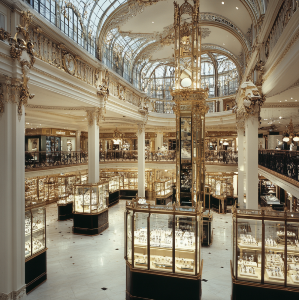 Here you find an area of the department store, which can be whatever comes up for you. Jewelry, clothing, makeup, furniture? Look around and picture what you see. Perhaps you see beautiful counters filled with diamonds, gold necklaces, and rings, and bright tiles on the floor. You see people walking.